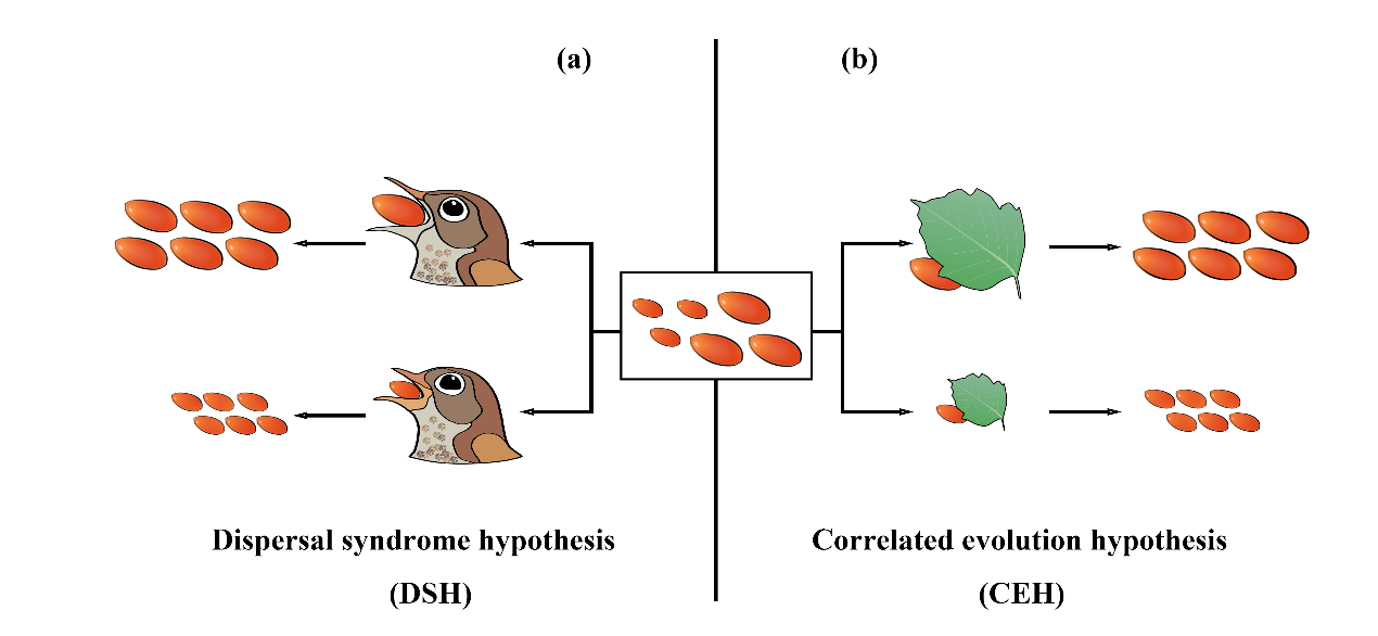 Dispersal Syndrome Hypothesis(DSH)(a)和 Correlated Evolution Hypothesis(CEH)(b)示意图