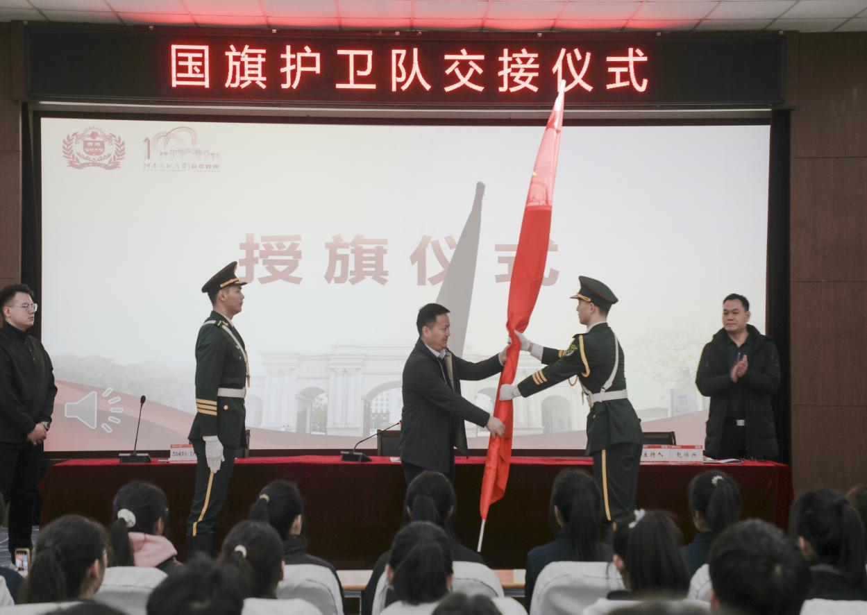 党委学工部部长葛照金为2022级国旗护卫队优秀护旗手和优秀教练员颁发证书,为2023级国旗护卫队授旗,并向同学们提出了三点希望。一是继续保持良好作风。在训练和升旗任务中养成的顽强拼搏、艰苦奋斗、团结进取的作风要保持下去,努力成就更优秀的自己。二是传承发扬国护精神。要把“特别能吃苦、特别能战斗、特别守纪律”优良传统接续传承下去,用到学习上去,带到同学身边,在班级、宿舍、学校、社会等场所发挥模范带头作用,引领带动更多同学持续向上向善向好。三是牢记学习本职本业。要以品学兼优的国护队员为榜样,带头勤奋学习,学好专业知识,在不懈奋斗中实现自己的人生目标。