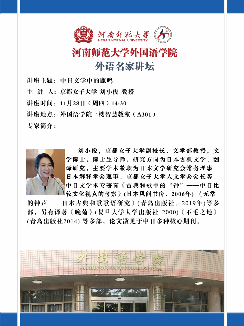 京都女子大学副校长刘小俊教授将应邀做客外语名家讲坛