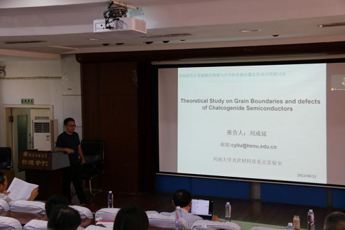 8月23日,应我校物理学院邀请,河南大学刘成延教授应邀为学院师生作题为“铜锌锡硫太阳能电池电极设计的理论研究”的学术报告,学院相关专业师生参加了报告会。硫族化合物锌黄锡矿Cu2ZnSn(S,Se)4(CZTSSe)由于其优异的光电性质、结构稳定、环境友好、原材料丰富和理论效率高的优点被认为是十分理想的半导体光伏材料。然而,目前报道的CZTSSe太阳能电池的最高效率只有14.9%,远小于相同衍生晶体结构CdTe的22.1%和Cu(In,Ga)Se2的23.4%。实验研究表明,导致效率较低的主要原因来自材料的晶界和本征缺陷引入非辐射复合中心和构成器件后电子收集界面处p-n结失效的问题。针对上述问题刘成延教授提出了半导体晶界、本征缺陷的钝化规则以消除CZTS晶界和体相中SnZn缺陷引入的深能级缺陷态,以及在电子收集界面处生成弱n型二次相的方案来尝试解决界面处p-n结构失效的问题。刘成延教授巧妙地将理论与实验相结合,在一定程度上突破了实验难点。会后,刘成延教授与学院师生就相关问题展开深入讨论与交流。专家简介:刘成延,河南大学教授,于2017年在加州大学欧文分校天文与物理系从事博士后工作,主要研