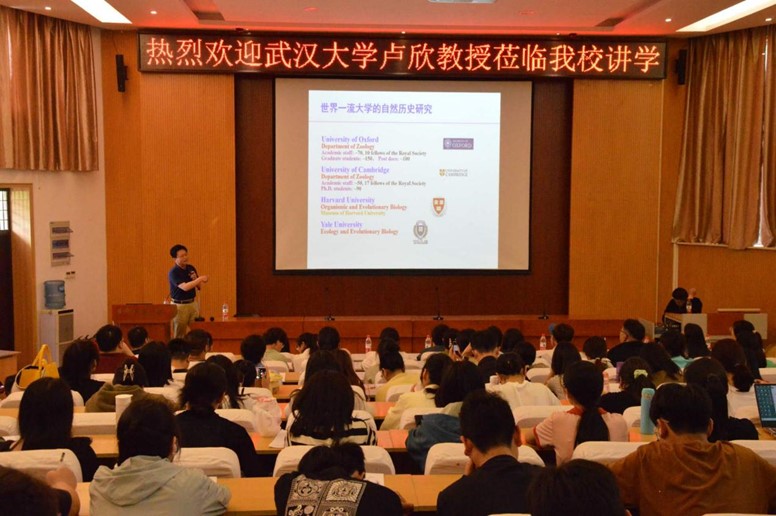 4月20日下午,应生命科学学院邀请,武汉大学教授卢欣莅临我校讲学,并在生物报告厅作题为“野外科学研究:诗和远方”的学术报告,学院师生200余人参加。报告会由院长余国营主持。卢欣一直在青藏高原从事野外研究工作。本次报告从野外科学研究的重要意义引入,介绍他所关注的科学问题,分享他在青藏高原从事鸟类研究的经历和感悟。利用野外长期探索研究的经验,卢欣阐述青藏高原鸟类的自然历史,揭示鸟类在极端环境下的社会性进化机制,为在极端环境下的动物生态保护提供科学依据。结合近四十年的科研经历,卢欣向与会人员分享自己的科研感悟:把野外科学探索当作一种生活方式,在理性的探索过程中体验感性的人生。卢欣的报告,传达了他科学严谨的学术态度,折射出他将科研与生活融为一体的人生理念。报告会结束后,他就相关问题与参会师生进行探讨。专家简介: 卢欣,武汉大学生命科学学院教授、博士生导师,国家杰出青年基金获得者(2004年),中国鸟类学会副理事长。主要研究方向:动物社会行为的进化。主持国家自然科学基金项目9项,其中杰出青年基金1项,重点项目2项,面上项目6项。在国内外各类刊物发表专业论文百余篇,主编教材《动物生物学实验指导》。