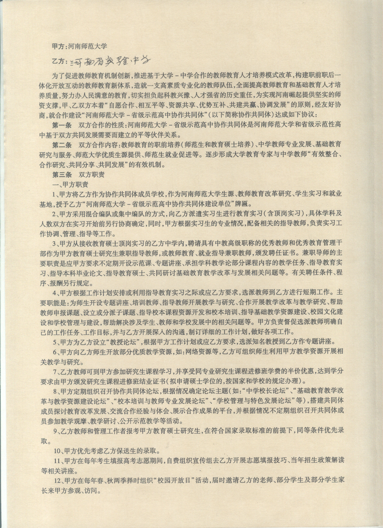 为了推进教师教育体系创新,推进基于大学-中学合作的教师教育人才培养模式改革,构建职前职后一体化开放互动的教师教育终身服务体系,我校与省内外100所省级示范性高中本着“自愿合作、相互平等、合作共享、优势互补、互利共赢、务实高效、共同发展”的原则,合作建设Betway官方客服-中学“‘1+100’协作共同体”(简称“1+100协作共同体”),并与各中学签订合作协议书,明确规范双方合作内容,双方职责等事项(省级100所示范性高中目录及协议书见附件)。