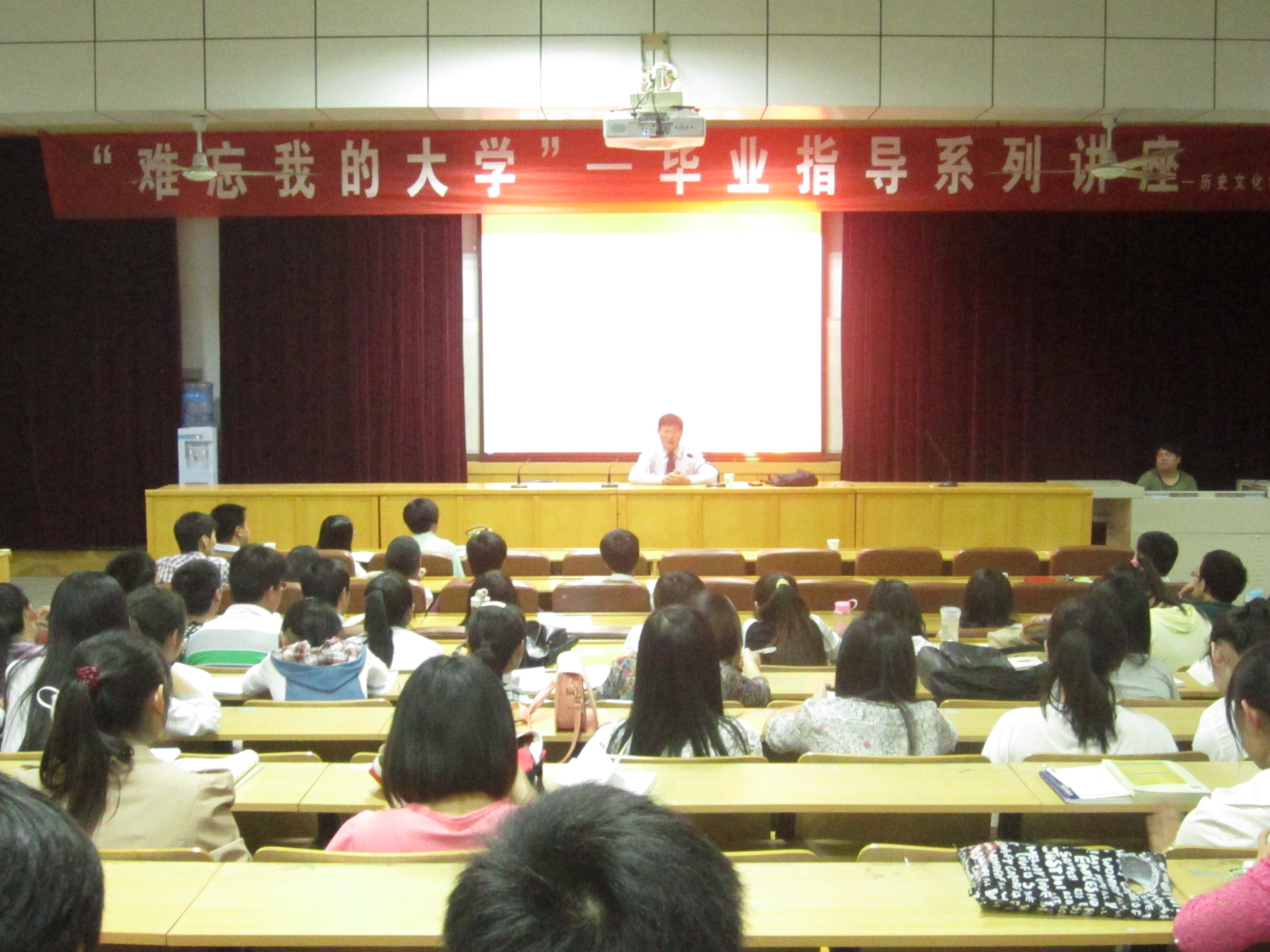 为帮助我院学生更好地适应大学毕业后的工作与生活,5月16日晚7点半,由历史文化学院主办的“难忘我的大学”——毕业指导系列讲座在党课教室举行。院长王记录应邀主讲,2009级辅导员闫冰、杜志亚出席,2009级学生二百余人聆听了讲座。讲座由院党总支副书记康海军主持。