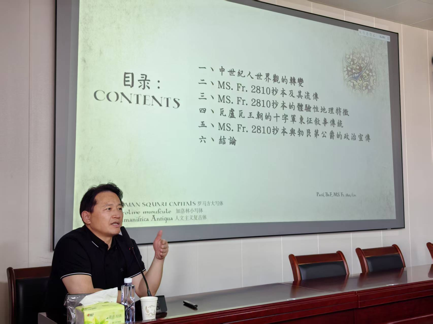 陈志坚教授以《浪漫的东方想象与权威建构:从MS Fr. 2810抄本看勃艮第公爵的政治宣传策略》为题,结合自身多年的研究经验,以中世纪人世界观的转变为切入点,深入剖析了15世纪初勃艮第公爵“无畏者”约翰委托制作的MS Fr. 2810抄本的主要内容及其意义和价值。