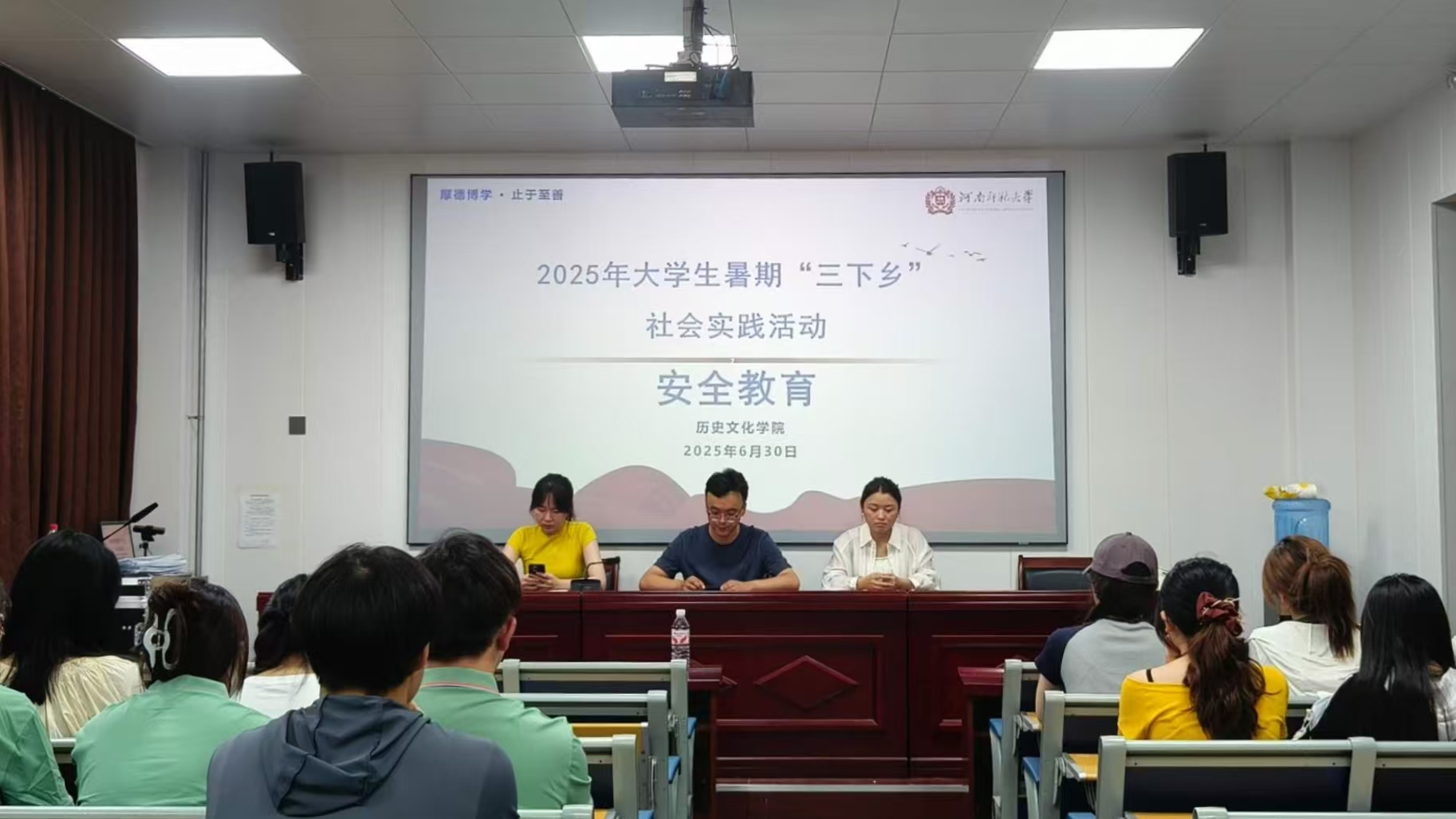 为深入贯彻落实立德树人根本任务,引导青年学生在社会实践中锤炼本领、增长才干,6月30日,历史文化学院举行2025年暑期“三下乡”社会实践活动出征仪式。学院团委书记庞振康、23级辅导员兼带队老师常筱沛、24级辅导员兼带队老师肖党霞及各实践团队负责人、队员参会。