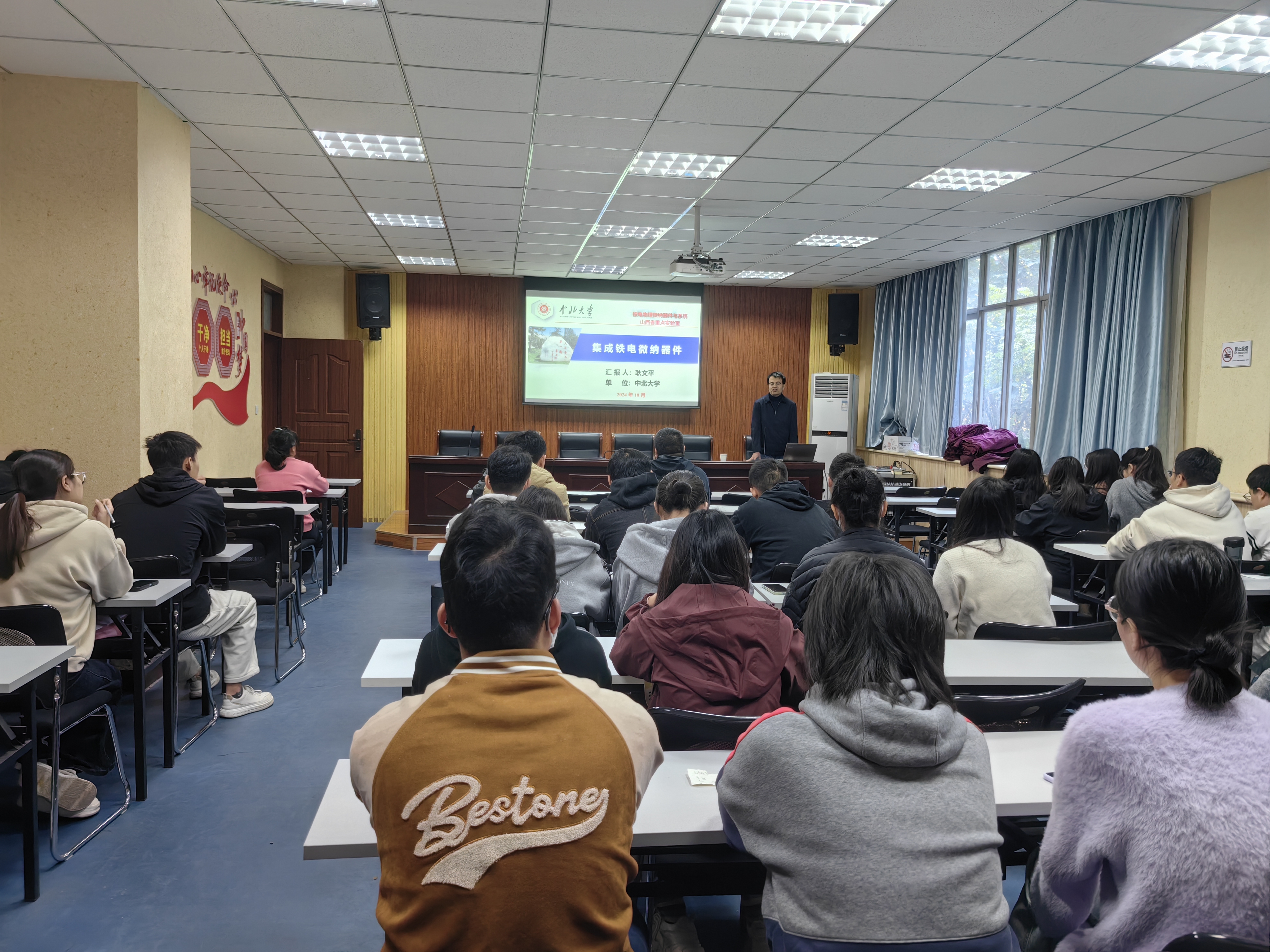 耿文平教授首先介绍了中北大学学科平台及研究方向;其次从基础原理到器件实现,再到系统集成,系统化介绍了自己团队研究集成铁电MEMS的过程;最后结合课题组成果介绍了所研微纳器件在低温传感、振动传感、微流控、电磁脉冲防护、含能芯片等领域的应用。该讲解提升了同学们对微纳器件应用领域的认知,为本专业的青年教师开拓思路,拓宽了以后研究的思维方式与方法。
