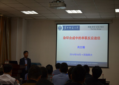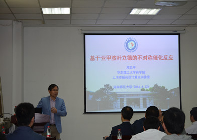 肖文精教授作了题为“杂环合成中的串联反应途径”的学术报告,简要介绍了可见光诱导光氧化还原催化的可行性与可能的途径,重点介绍了光氧化还原催化的[3+2]环加成/氧化芳构化,以及可见光诱导的碳-硼键的空气氧化、[3+2]环加成反应、氮自由基反应、内酯化反应和羰基化反应。邓卫平教授作了题为“基于亚甲胺叶立德的不对称催化反应”的学术报告,介绍了基于二氢咪唑并喹啉骨架的手性N,O配体的设计及在亚甲胺叶立德参与的不对称[3+2]偶极环加成中的应用,构建了含季碳、螺环、邻二氨基等手性吡咯类产物。虞心红教授作了题为“一箭双雕:不对称‘联产’及双功能化”的学术报告。报告阐述了手性药物的合成及应用,并着重介绍了基于取代芳香醛与氨基酸、芳香烯醛(二烯醛)的双功能化以及21世纪以来新技术和新理念变革下的新药研究。最后,与会师生就报告的内容提出了一系列问题,三位专家师一一进行了解答,现场气氛活跃。