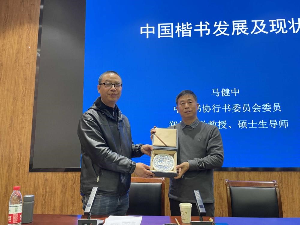 开班仪式后,马健中教授在其主编的《北朝造像题记六品》上亲笔题字并赠与美术学院,陈巍院长表示衷心感谢并回赠由美术学院陶艺工作室制作的陶艺月饼,仪式结束后马健中教授围绕楷书的发展历程,为学员们带来《图说书法》课程。