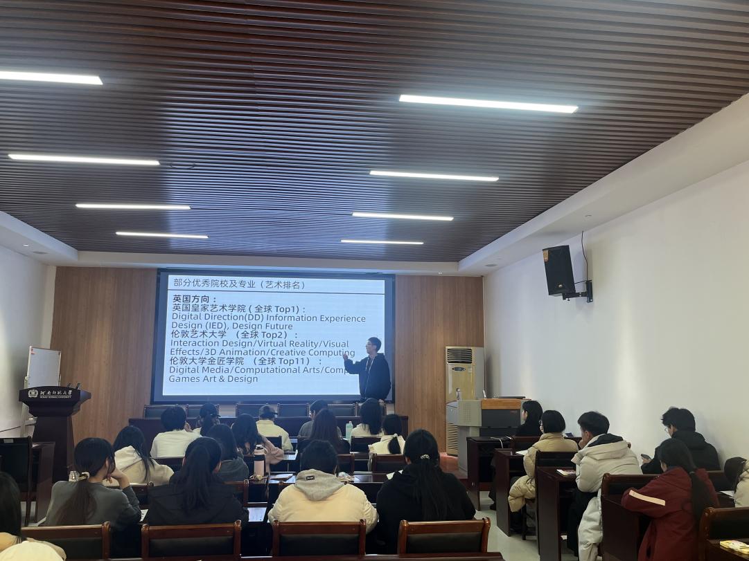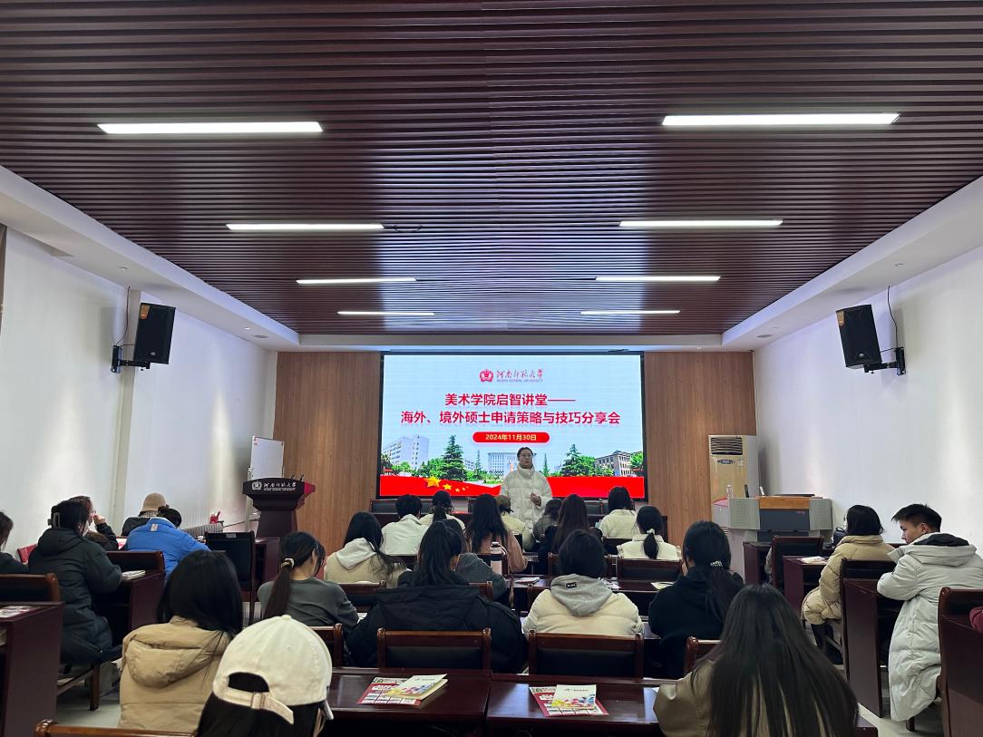 2024年11月30日下午,美术学院海外、境外硕士申请策略与技巧分享会在崇美楼三楼会议室召开。本次会议采取线上线下相结合的方式,线下邀请了英国利物浦大学硕士刘玲靖、伦敦艺术大学硕士孙凡杰为主讲嘉宾,活动由2023级辅导员黄清主持,各年级共40位同学参加。