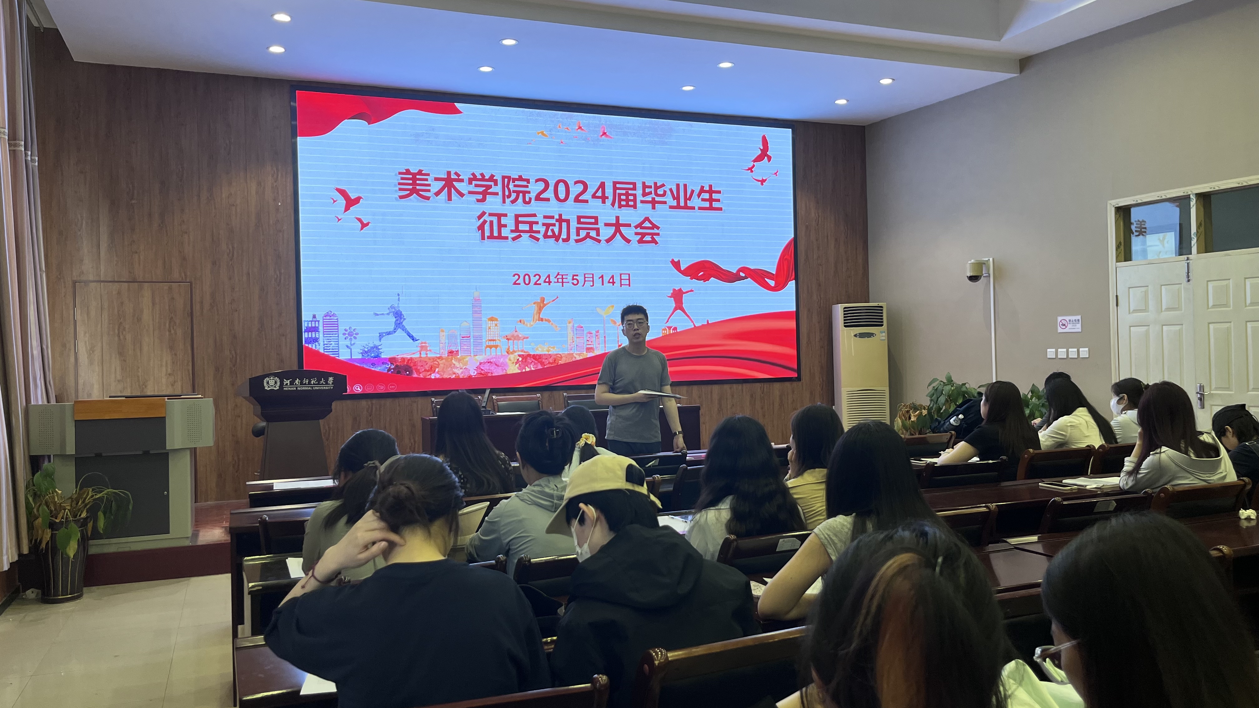 为做好2024届毕业生入伍政策宣传工作,鼓励毕业生积极参军入伍,美术学院于5月14日在崇美楼三楼多媒体教室面向本科毕业生开展征兵政策讲解大会,毕业班专兼职辅导员及全体毕业生参加会议。会上,辅导员张鹏飞通过播放征兵入伍宣传片以及近几年学院毕业生参军入伍的真实案例,向同学们详细介绍了毕业生应征入伍的报名时间、基本条件、入伍流程、参军待遇、军旅生活、最新政策等相关信息,并解析了毕业生应征入伍的相关热点问题。随后,我院退伍军人郭彤彤给大家分享入伍心得,她讲述了她对于国家情怀的深刻理解,以及个人在保家卫国、服务人民中所承担的责任和使命,进一步激发了学生们的爱国情怀和社会责任感。最后,张老师进行总结,他表明大学生是宝贵的人才资源,大学生参军入伍符合服务经济社会发展和维护国家长治久安的客观要求,呼吁青年学生要切实增强责任感与使命感,自觉将个人理想融入伟大的中国梦与强军梦之中。少年自强,国之所望,征兵固防,安国兴邦。此次大会旨在提高学生参军入伍的热情,进一步激发了学院学生的家国情怀,强化了同学们保家卫国的责任感和使命感。(美术学院 张鹏飞 金家盈)