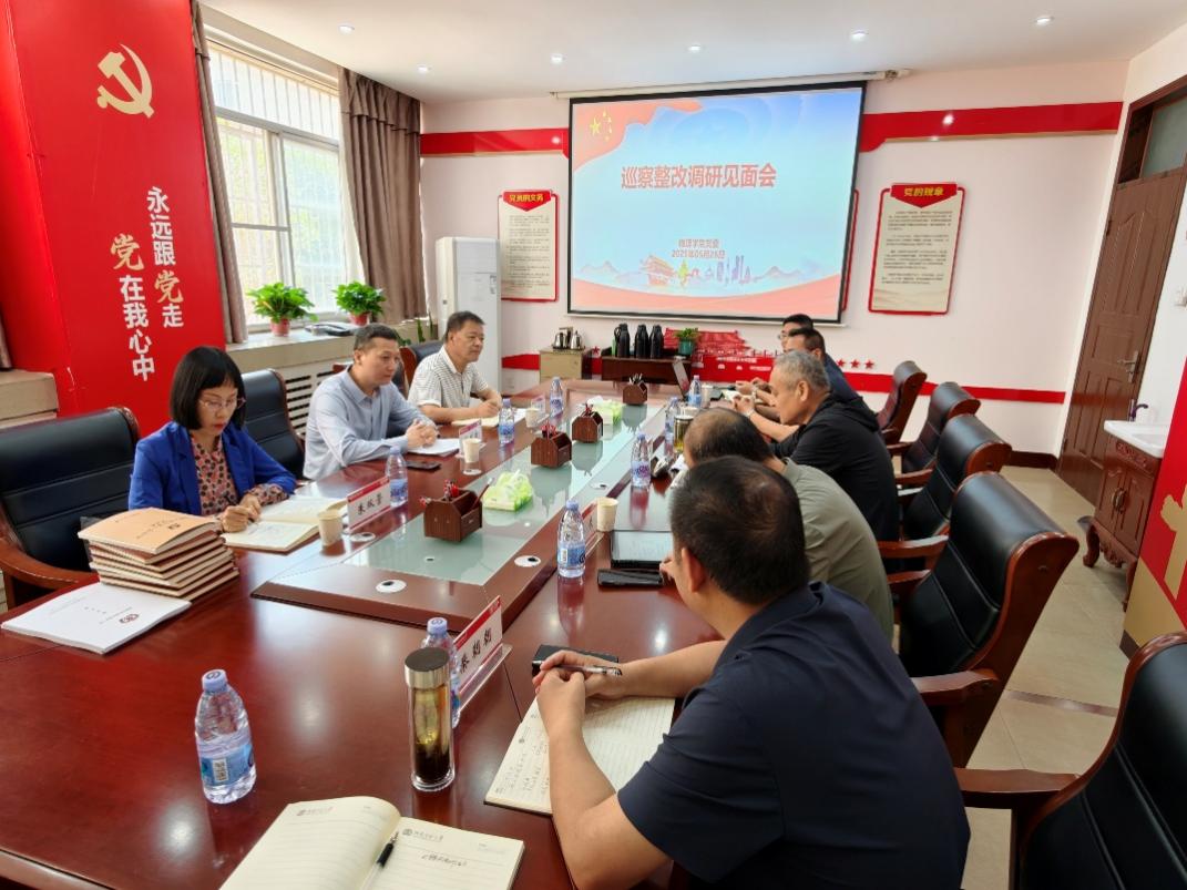 5月19日,党委巡察办一行到物理学院调研督导巡察整改工作。调研督导会在物理学院物理北楼A122举行,物理学院领导班子全体成员参加,座谈会由物理学院党委书记陈明银主持。