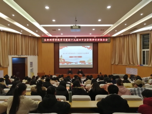 为深入学习贯彻党的十九届四中全会精神,扎实推进“不忘初心、牢记使命”主题教育,12月24日晚,生命科学学院在生物报告厅举行党的十九届四中全会精神宣讲报告会,由校宣讲团成员、马克思主义学院副院长李翔作宣讲报告。生命科学学院师生代表等近200人参加报告会。报告会由生命科学学院党委副书记陈勇主持。