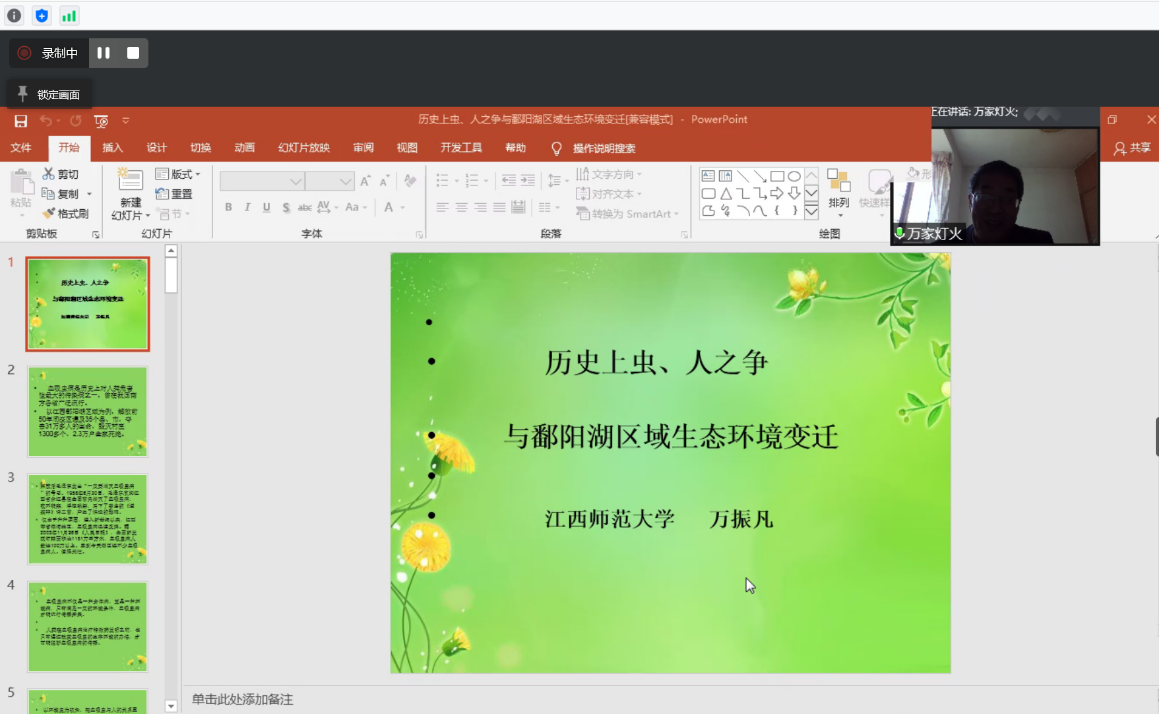 3月28日下午,中共医疗卫生史前沿系列讲座2022年第3讲在政治与公共管理学院牧野讲堂开讲。《苏区研究》杂志主编、江西师范大学博士生导师万振凡教授在线上为学院师生作了题为《血吸虫病与鄱阳湖区域生态环境变迁》的学术报告。报告由学院院长李洪河教授主持,校内外百余位师生参与。