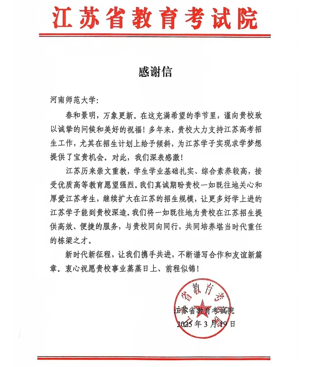 近日,我校收到江苏省教育考试院发来的感谢信,信中高度赞扬了我校对江苏高考招生工作的长期支持,并对未来深化合作提出殷切期望。这封信,不仅是对我校招生工作的充分肯定,更彰显了校际协同育人的深远意义。