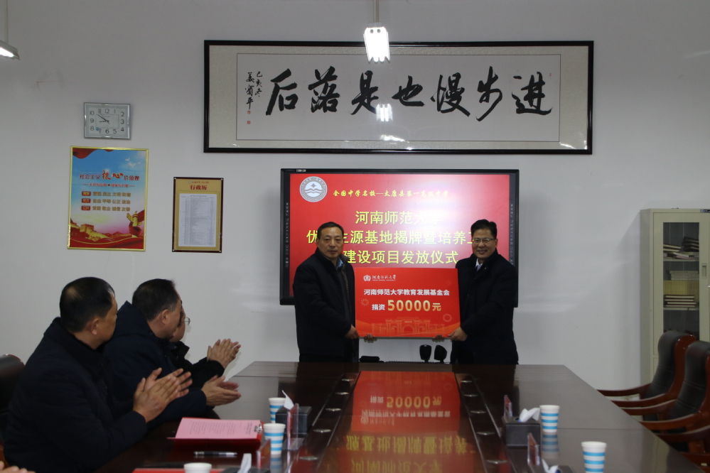 于庆生院长和沈世弘校长为学校优质生源基地揭牌。于庆生院长向太康县第一高级中学发放“优质生源培养工程建设项目”经费,太康县第一高级中学校长沈世弘代表学校接收项目经费。
